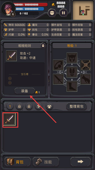 2、在背包中選中【粗糙短劍】,點(diǎn)擊【裝備】按鈕可提升攻擊屬性,增強(qiáng)對(duì)戰(zhàn)中的輸出能力。