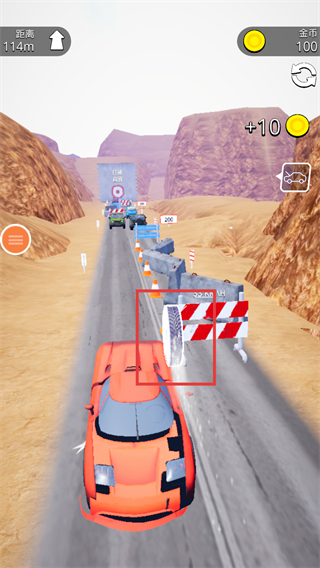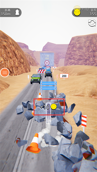 2、駕駛車輛前進(jìn),躲避道路上的紅白路障,同時(shí)收集金幣,累積前進(jìn)距離。