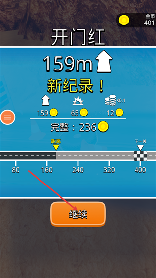 4、達(dá)成【159m-新紀(jì)錄】后,點(diǎn)擊“繼續(xù)”按鈕,可進(jìn)入下一關(guān)繼續(xù)挑戰(zhàn)。