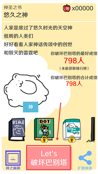 1、點擊【Let's-破壞巴別塔】按鈕開啟玩法,可積累破壞成績,目標(biāo)突破當(dāng)前【798人】的記錄。