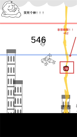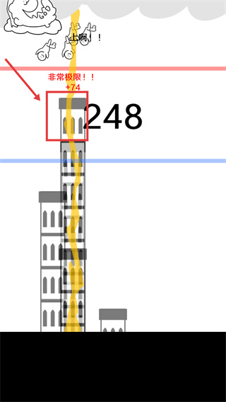 2、得分機(jī)制清晰明確,塔的最高點處于藍(lán)紅兩線之間時破壞可累積積分,越接近紅線得分越高,頂著紅線消除能直接獲得100積分。