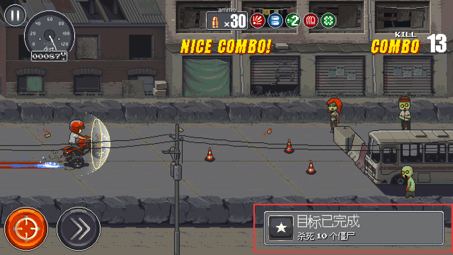 2、戰(zhàn)斗中需關(guān)注任務(wù)目標提示,優(yōu)先完成【殺死10個僵尸】類任務(wù),觸發(fā)連擊提升獎勵收益,同時保護大巴安全。